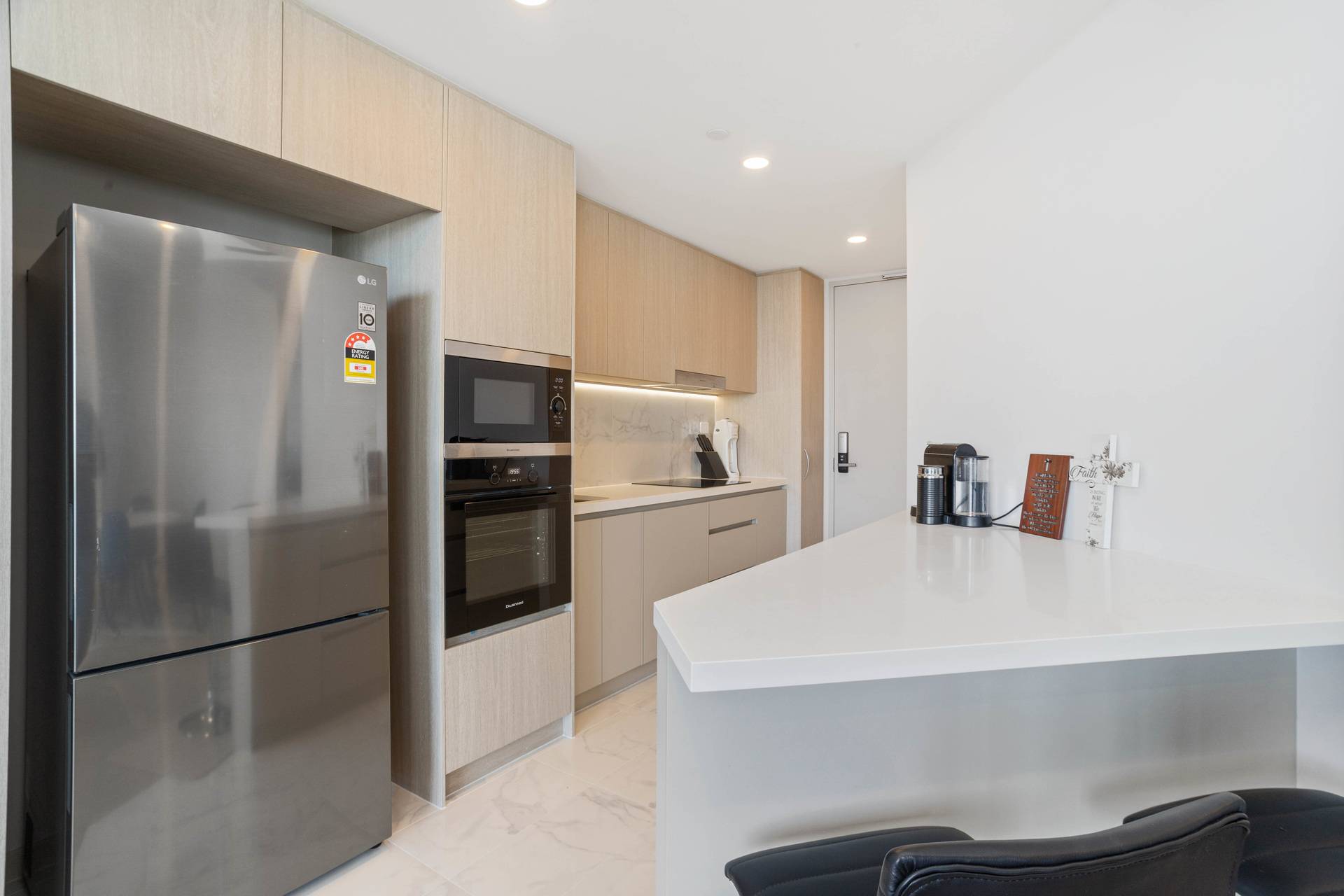 * Modern kitchen with stone bench tops, high end appliances and dishwasher