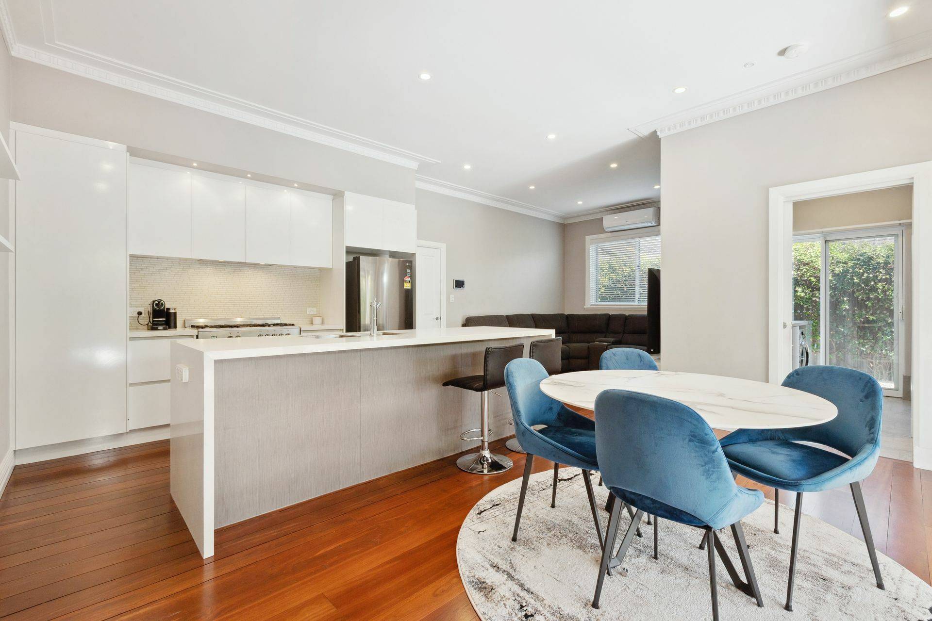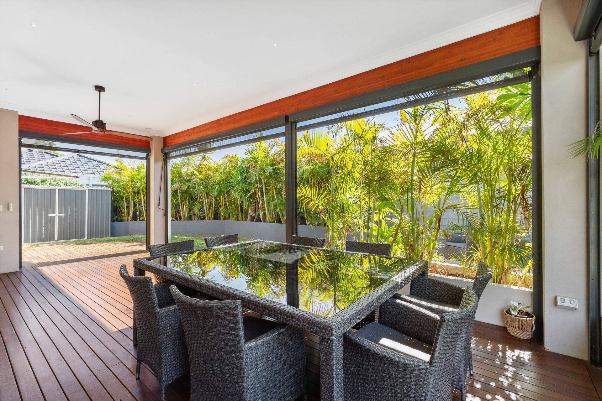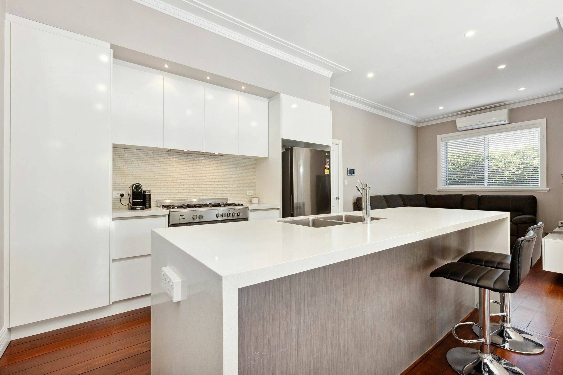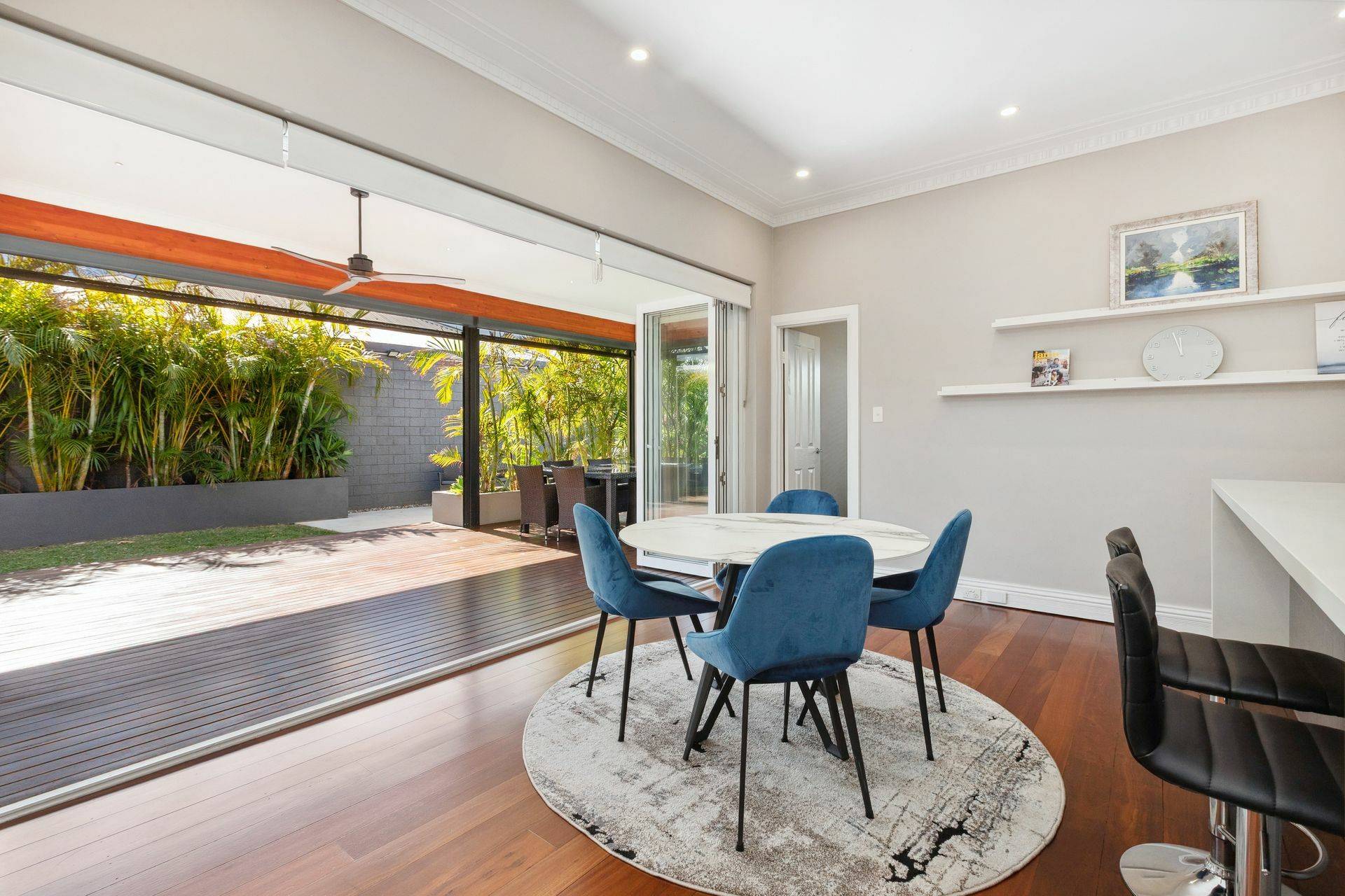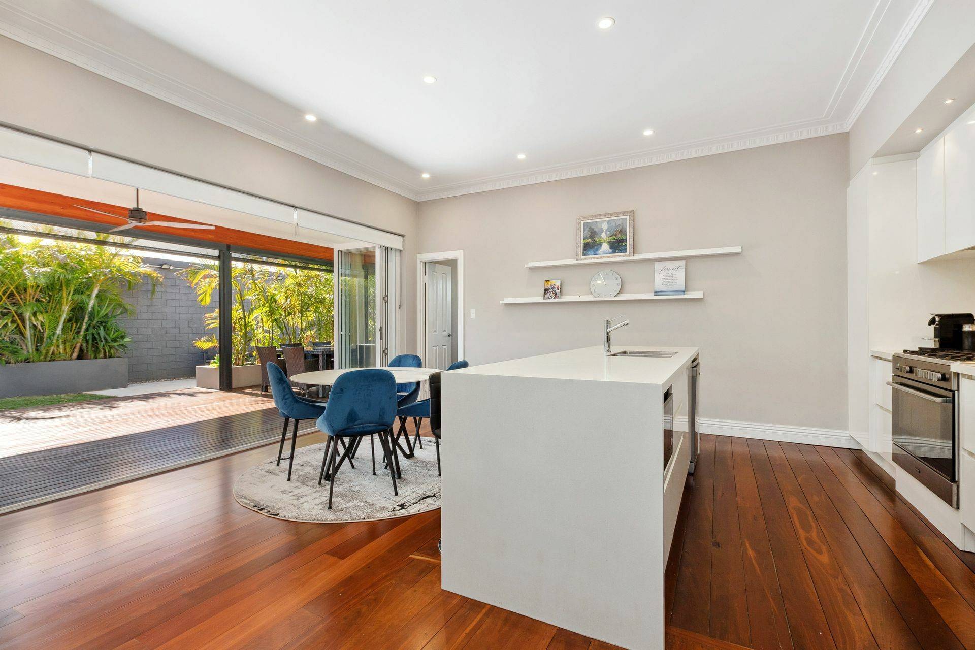 The open plan living space is overlooked by a contemporary kitchen with quality appliances, stone bench tops and ample storage options. Full length stacker doors seamlessly lead to the all-weather alfresco with pull down blinds – which almost doubles your indoor/outdoor living space! The area is overlooked by mature gardens and green screening which makes the outside world fade away.