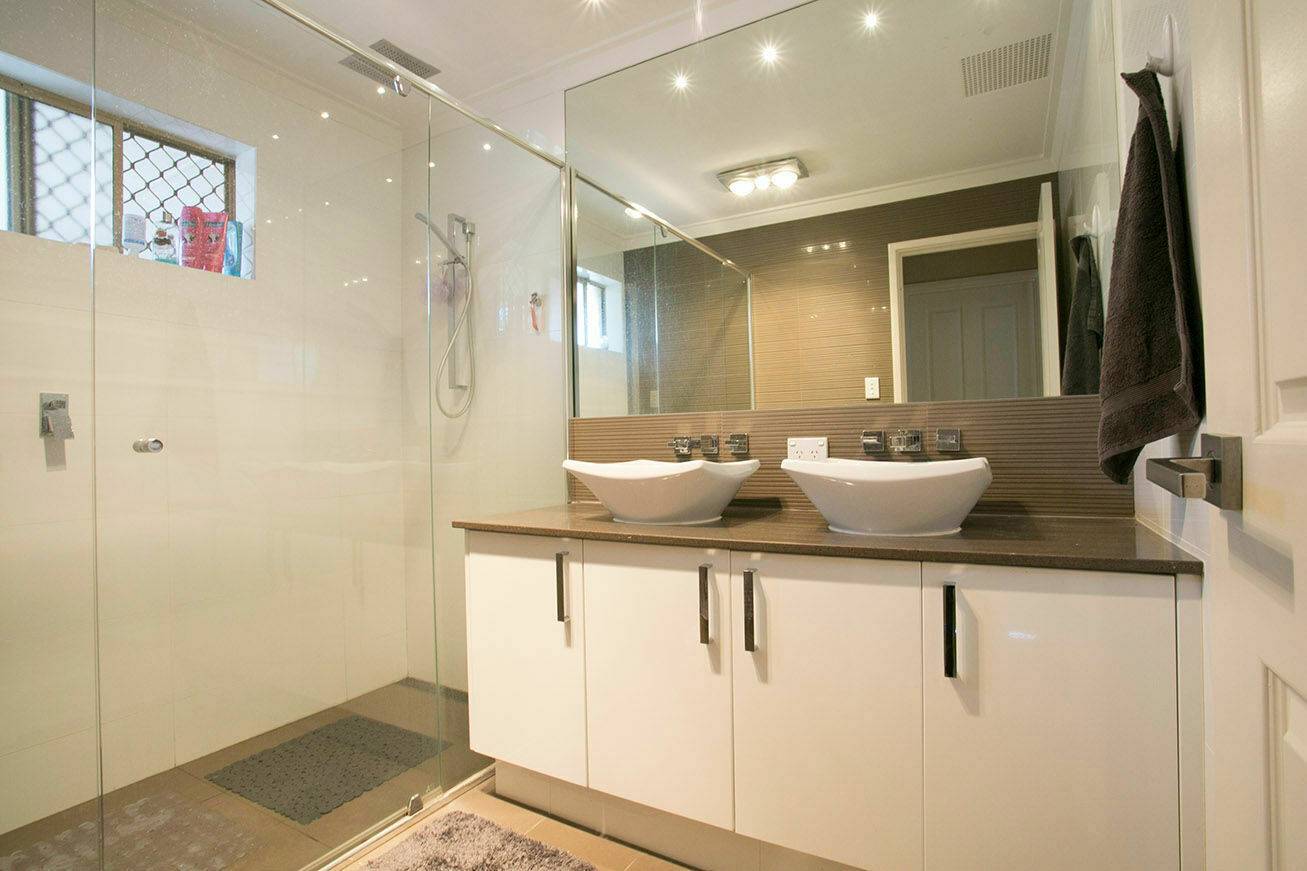 * Modern bathroom that includes his and hers basin, semi frame-less shower screen and floor to ceiling tiles