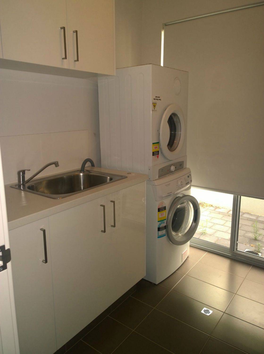 Laundry with ample cupboards and a sliding door to separate outdoor area for clothes hanging