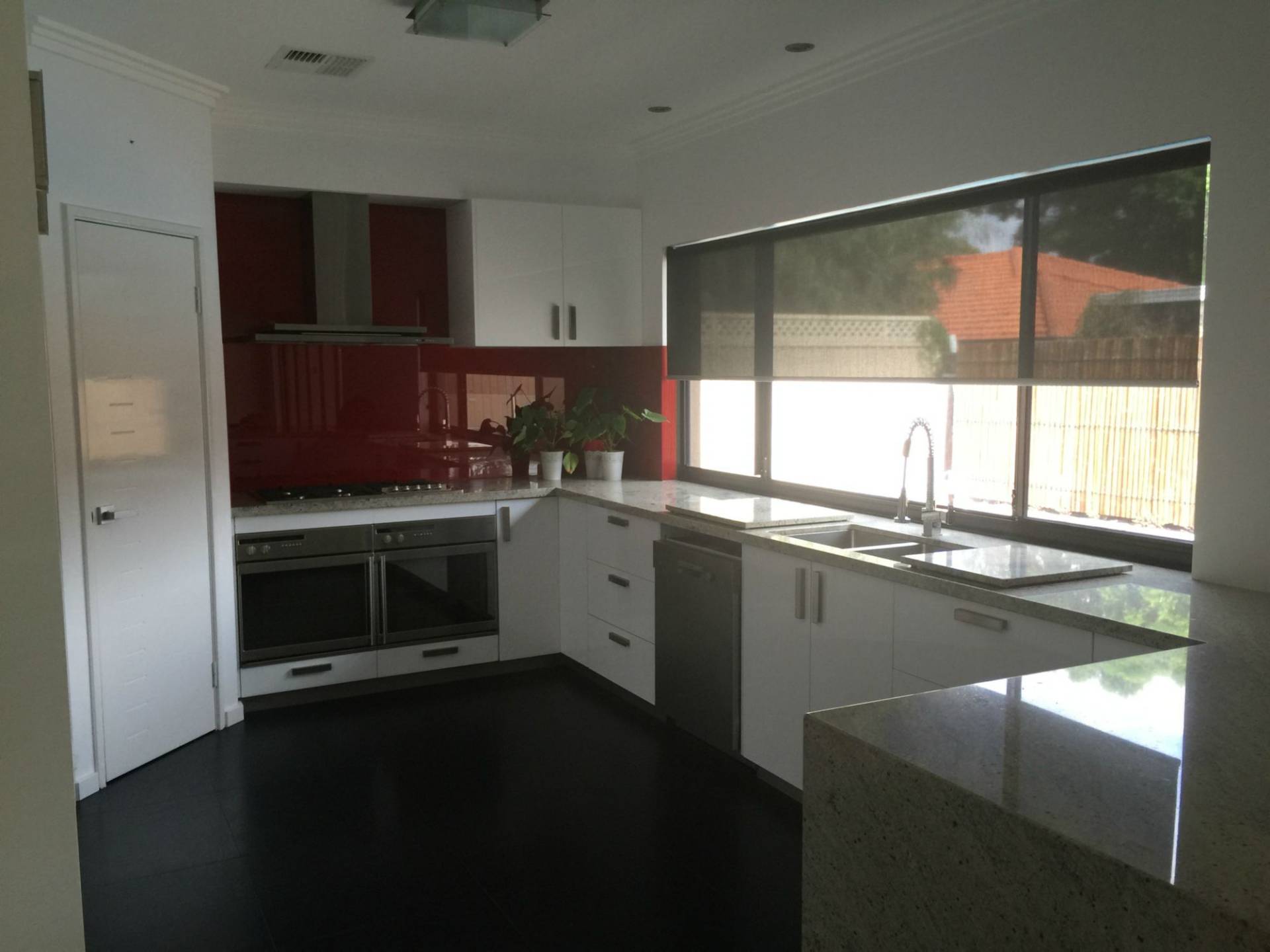 - large kitchen with stone water fall bench tops, double oven and dishwasher