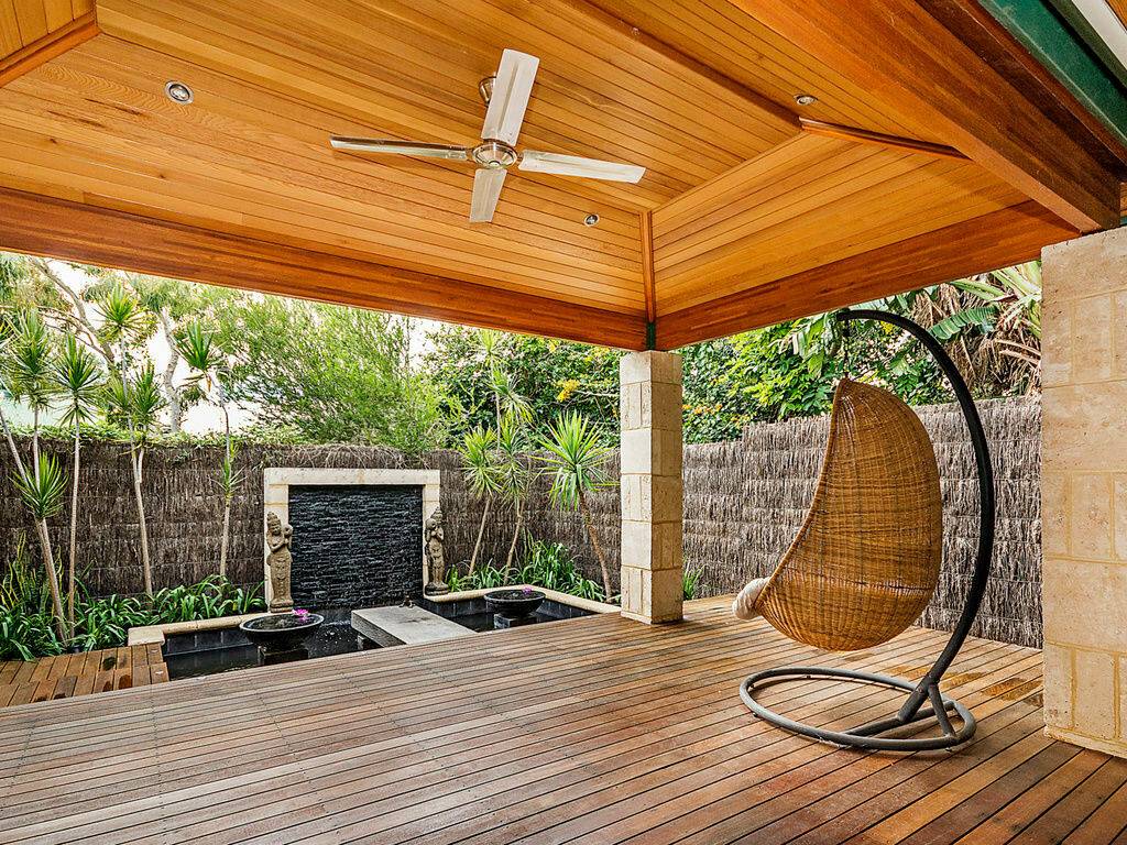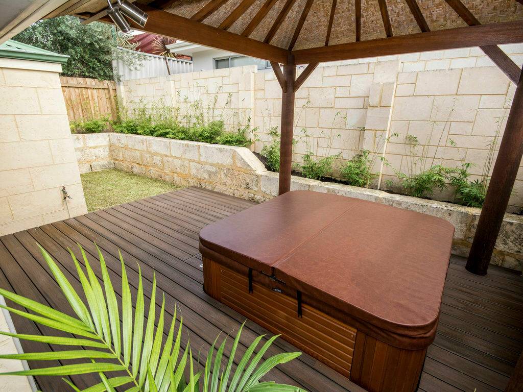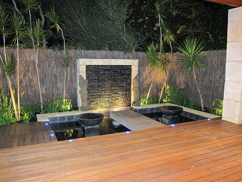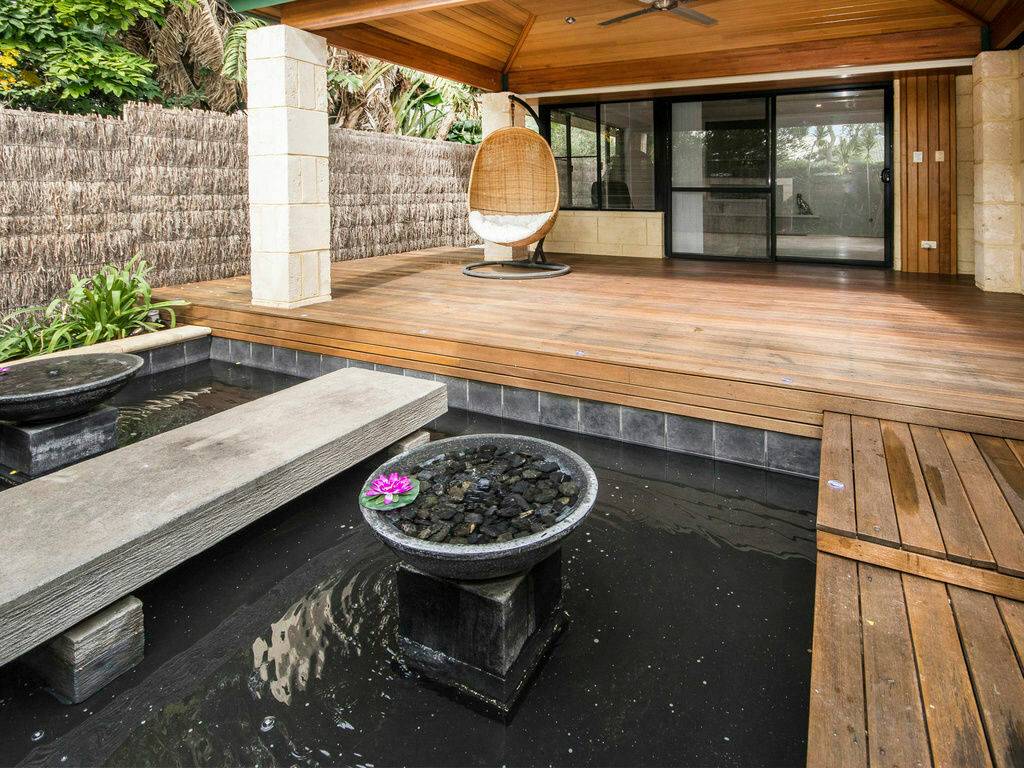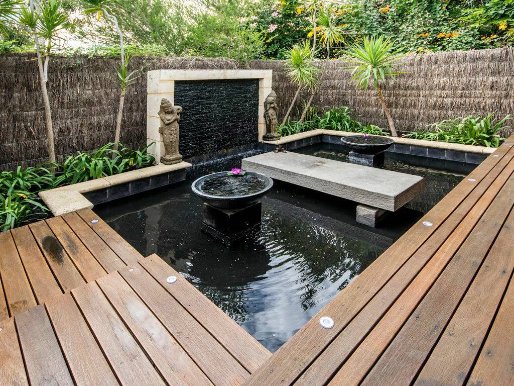 2 Relaxing areas one with a spa area with decking, the other main outside area has a resort like water feature with decking again and brushwood fencing ,