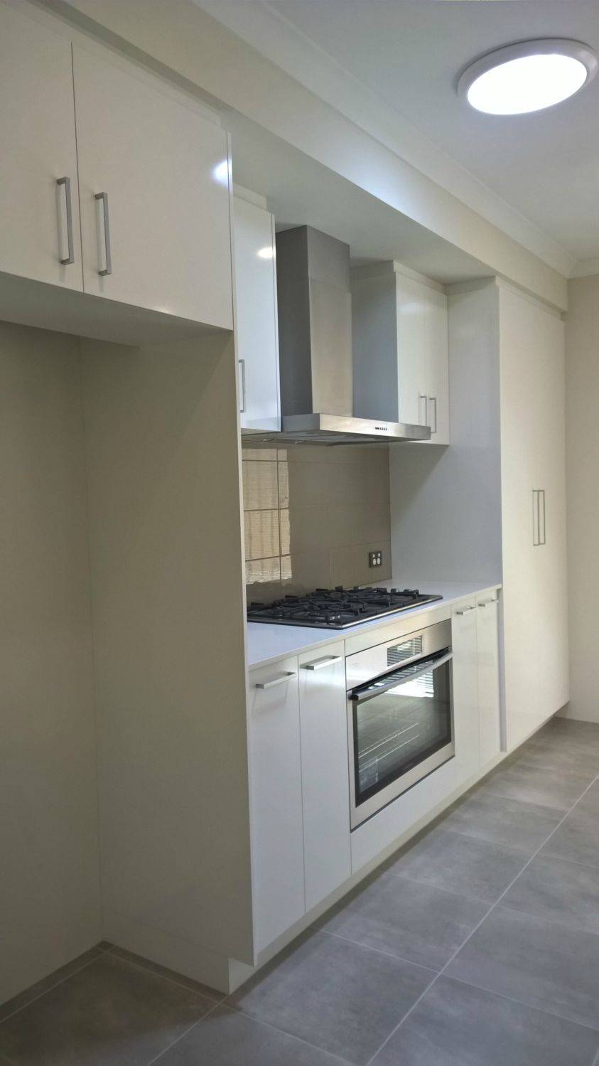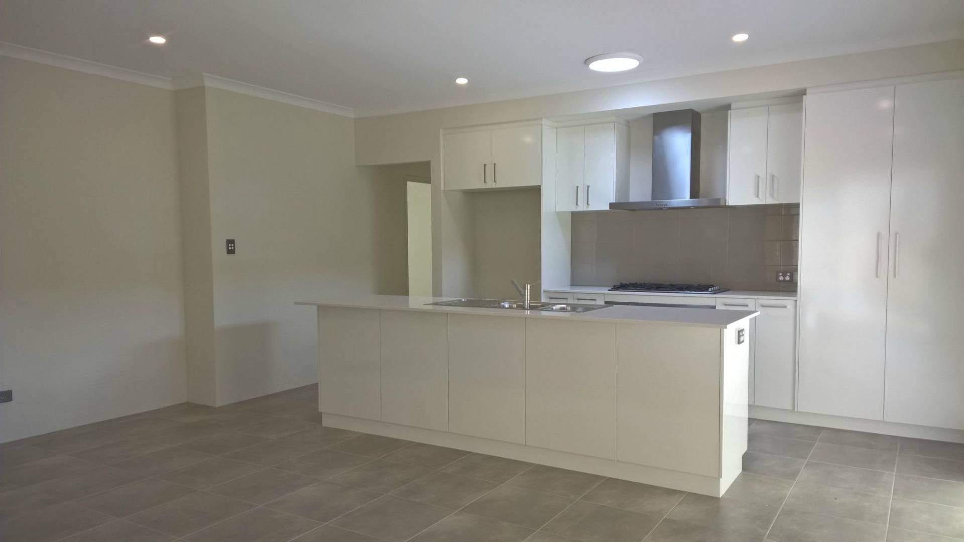 Modern and tastefully finished kitchen with stone bench tops, ample cupboard space, double fridge recess, gas stove, 900mm oven and stainless steel rangehood.