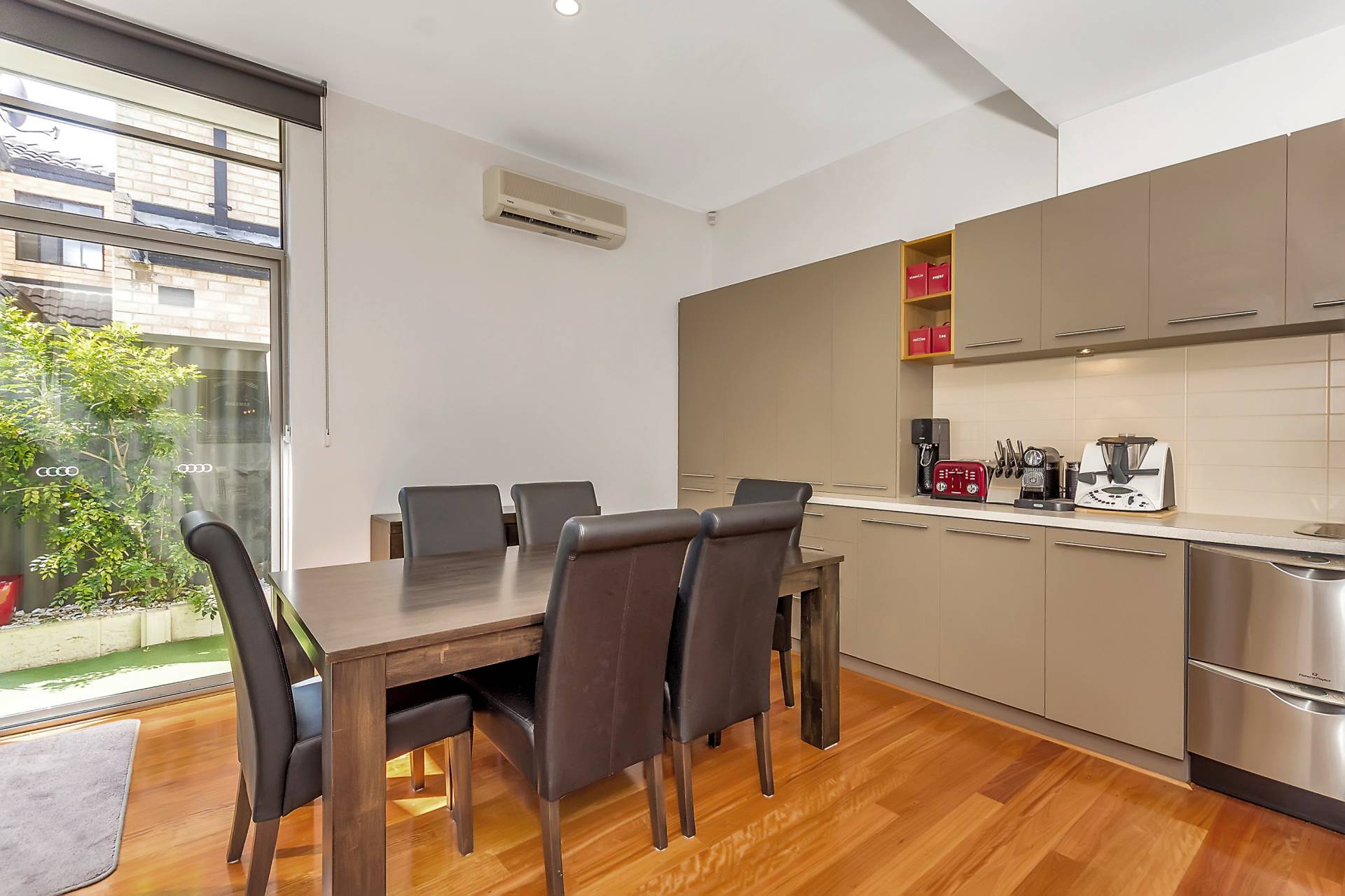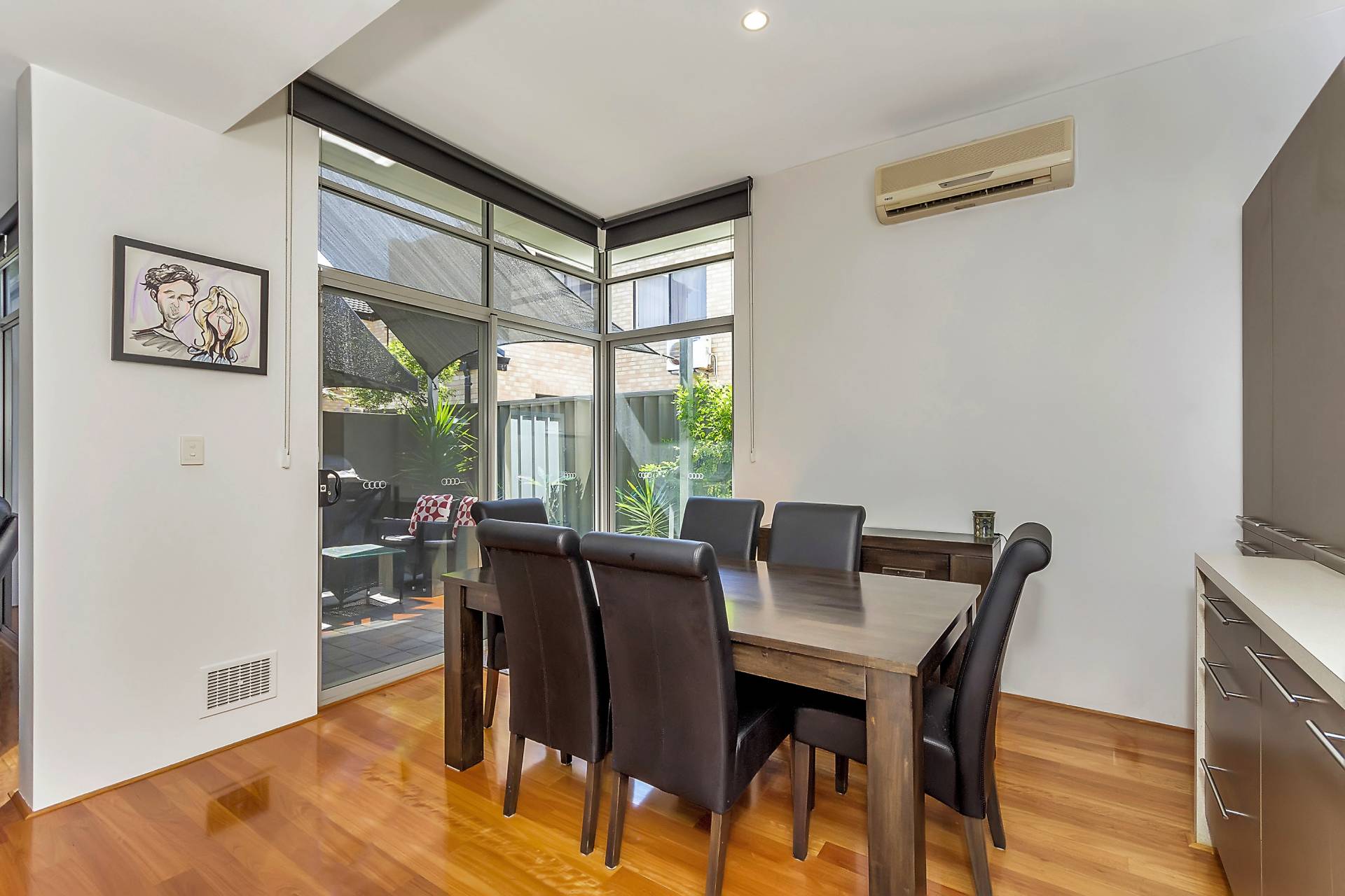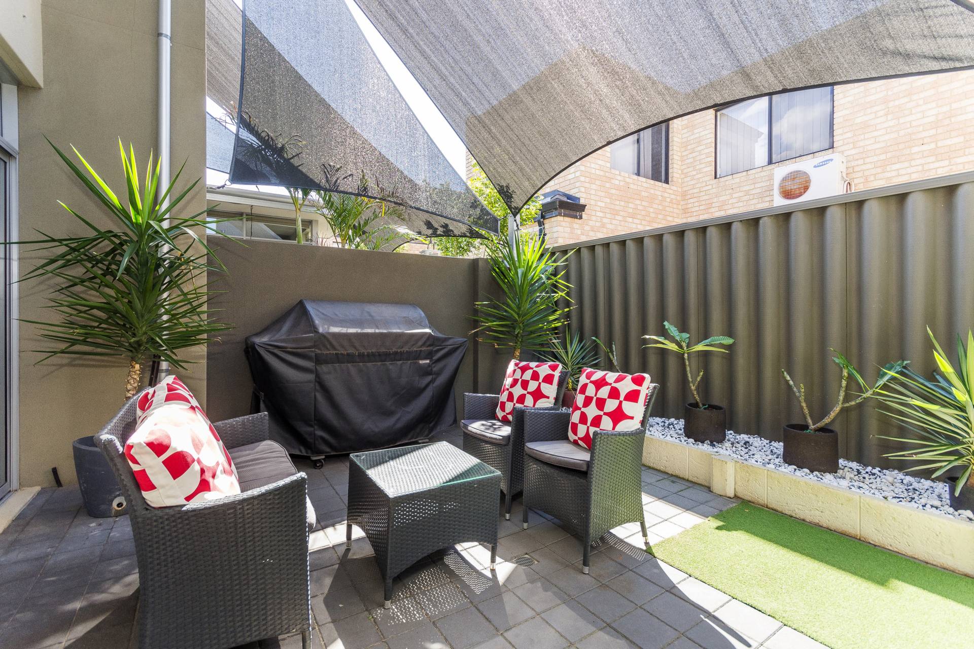 Private rear courtyard space and storage area to garage. Split system air conditioner to the living space and master bedroom.