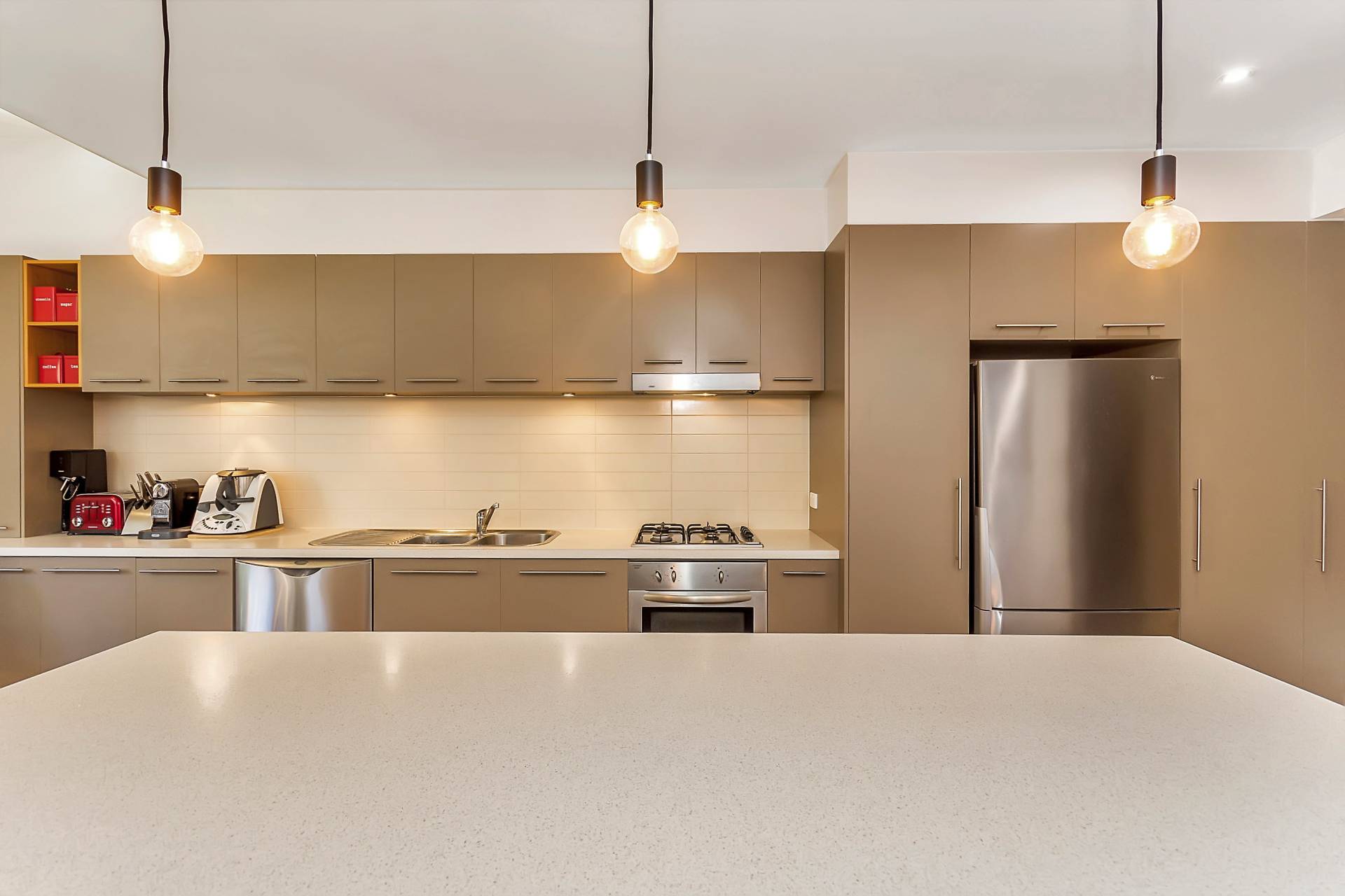 The kitchen is well equipped with ample cupboard and pantry space, large center island stone benchtop/breakfast bar, gas stove and dishwasher. This area is overlooked by the lounge and dining areas.